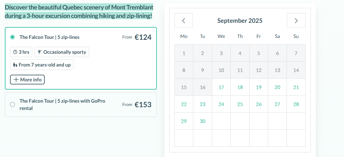 On the activity description page, select an offer, then choose a suitable date on the calendar.